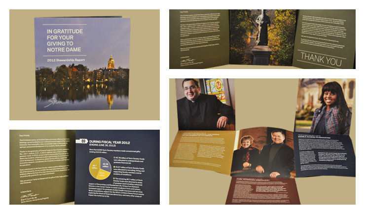 Design for a brochure to thank current donors and encourage new gifts to the Sorin Society by highlighting three important aspects of University life impacted by the group's fundraising efforts