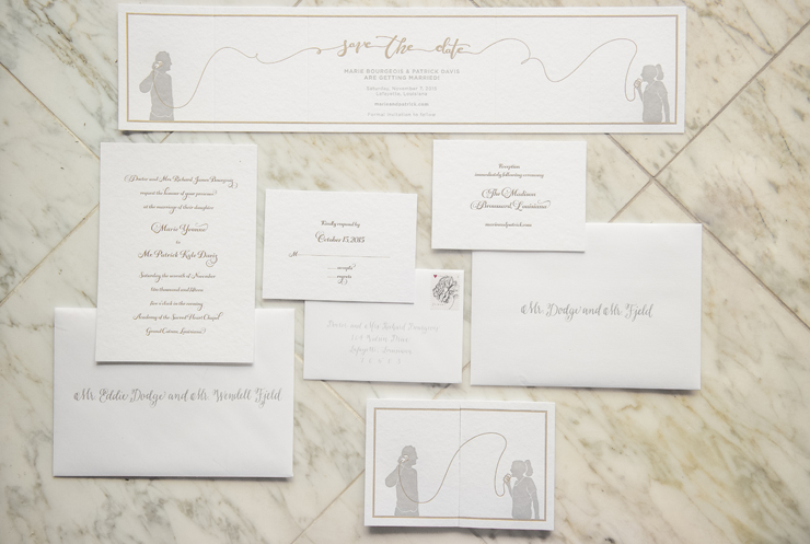 Hand-lettered save the date cards and invitation package for Patrick + Marie's wedding letterpressed by Rohner Letterpress, Chicago, evelope calligraphy by Mary Catherine Dunphy, and photographed by Catherine Guidry