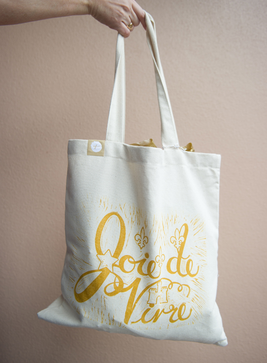 Hand-lettered and illustrated tote bags block-printed in gold ink, photographed by Catherine Guidry
